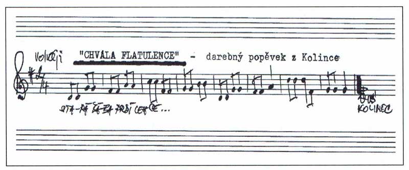 Když mnozí kolinečtí přátelé hudby, jídla, pití a humoru usedli ve známém hostinci Aloise Zajíce „U zeleného věnce“, těšili se na mnohá překvapení i populární extempore! Jedno z nich se nazývalo tak něžně. „Chvála zlatulence“. Nebyla to píseň beze slov, ale o jisté velice důležité lidské činnosti. Sólistou býval pan hostinský se svým „lehce seškrceným barytonem“. Jako orchestr ve vyzpívání meziher v bujarém veselí sekundovali štamgasti. Sólista upřel pozornost vždy na starší generaci, pro níž každé lidské ulevení „per vias naturales“ je lehce omluvitelné. Na následující melodii (viz příloha) spustil: